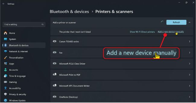 First, in Windows 11, click the Start button followed by the Settings cog, and then ‘Bluetooth & devices’ followed by ‘Printers & scanners’. Next, click the ‘Add device’ button, wait for a moment while Windows scans for new printers, then click the ‘Add a new device manually link’ (see screenshot above). Now, in the Add Printer box, click Microsoft followed by Microsoft PCL6 Class Driver (see screenshot left), then click Next. Give the printer a different name (optional), then click Next followed by Finished.