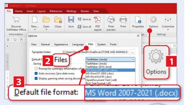 How you do this depends on the toolbar you’re using. I use the red ribbon, which means clicking File, followed by the Options icon ( 1 in our screenshot) 3 then the Files tab 2 .