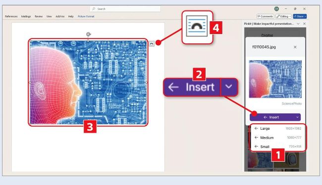 The Pickit add-in for PowerPoint and Word has thousands of images you can insert without copyright. Open a document or presentation then click Home at the top followed by Add-ins at the top right. Now search for pickit and click the icon that appears. Next, search for an image or scroll down and click a collection that sounds interesting. When you’ve found a picture, click the Insert dropdown menu to pick a size ( 1 in our screenshot) followed by Insert 2 and it’ll appear in your presentation or document