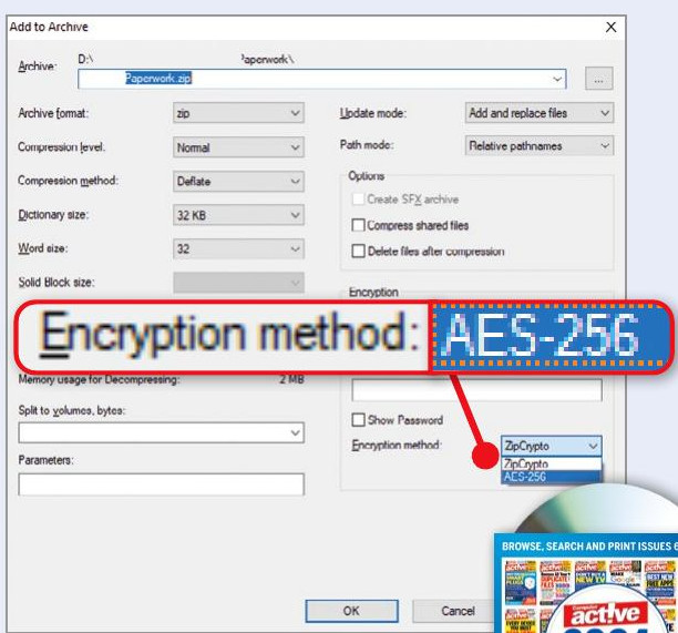 I do this by using the free compression tool 7-Zip (www.snipca.com/54175). I select AES-256 in the ‘Encryption method’ dropdown menu (see screenshot) and keep the password somewhere safe. I’ve read that it would take a modern computer longer than the age of the universe to crack AES-256, which is about as safe you can get!