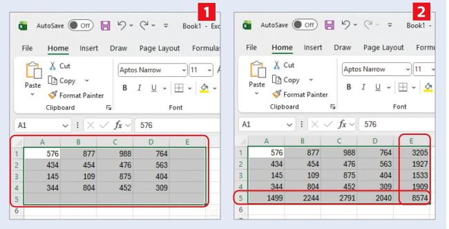 In our example, we want to add up rows (A1:D1, A2:D2 etc) and the columns (A1:A4, B1:B4 etc). We do this by selecting them and dragging the highlighted box so it includes the E column to the right and the A5:E5 row at the bottom (see screenshot 1 ). We then press Alt+= and the added totals appear in that column and row 2 .