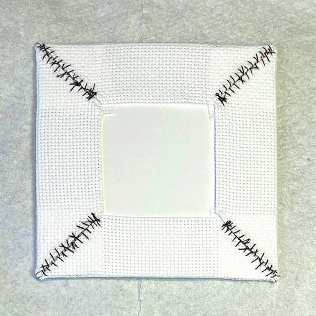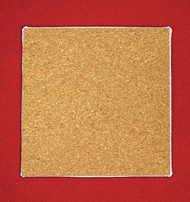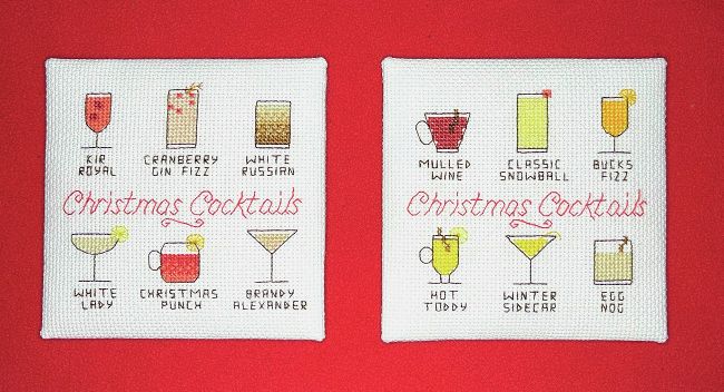 Imade Emma Congdon’s Christmas Cocktails coasters from the December 2023 issue (Festive Fizz) and mounted them onto cork squares as a holiday gift. I thought you’d like to see my process. I first mounted them onto heavy cardstock topped with a white felt cushion. I stitched over one on 18 count aida, which fit perfectly on the 4in-square sticky-backed cork squares I found online.