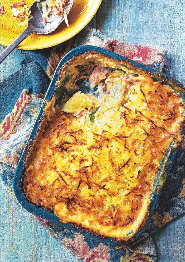 Leek and ham hock gratin