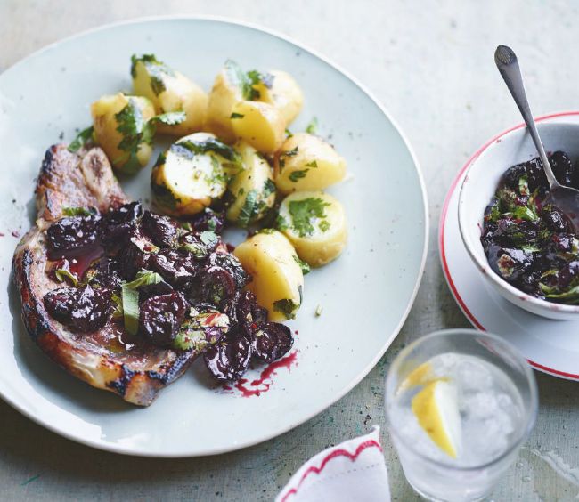 4. Meanwhile, heat a large non-stick frying pan with a little oil, wipe the buttermilk marinade off the veal chops with kitchen paper (discard the rest), then add the chops to the hot pan. Fry for 2-2½ minutes on each side for medium-rare, depending on the thickness. Heat the cherry sauce and stir in the herbs. Serve the potatoes, chops and sauce together.