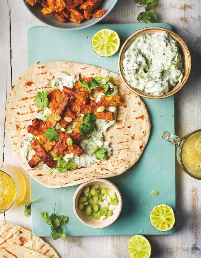 “Henry’s mum showed him how to make a tandoori mix many years ago. It’s all about good-quality yogurt and wonderful spices (and if you want a shortcut you can even buy ready-made tandoori spice). For this recipe, we’ve used our own spice mix and plant-based chick’n chunks to create a kebab-shop-style dish with a tangy mint raita. Get your grill hot, hot, HOT, to mirror the tandoor oven, and get ready for a marinated masterpiece of a fakeaway!”