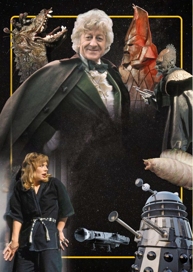 A Drashig in Carnival of Monsters; Jon Pertwee as the Doctor in The Time Warrior (1973-74); Omega in The Three Doctors; a Draconian in Frontier in Space; giant maggots in The Green Death; a Dalek in Planet of the Daleks; the Master’s spaceship in Frontier in Space; and Jo Grant (Katy Manning) in the same story.