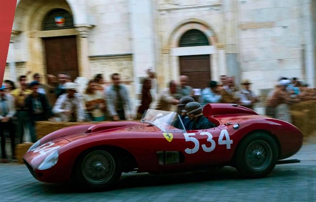 The iconic Ferrari 335S Spider, numbered 534, as driven by Peter Collins (Jack O’Connell) in the 1957 Mille Miglia race;