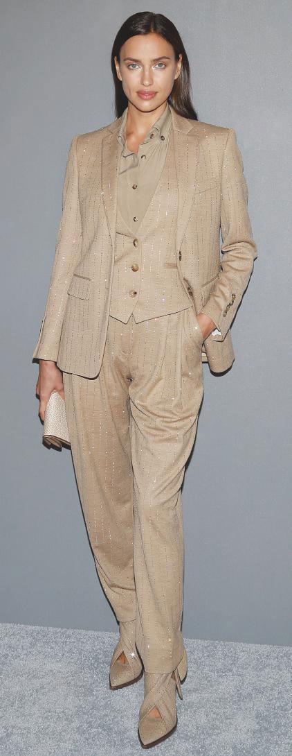 Irina Shayk goes for gold-flecked beige in a Burberry metallic pinstripe suit and heels