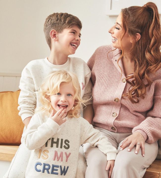Stacey Solomon has teamed up with Primark on a sweet range of children’s clothes and accessories – modelled here by the presenter and her sons Leighton, nine, and Rex, two. You’ll find cute slogan sweaters and cosy loungewear in soft pastel and cream tones.