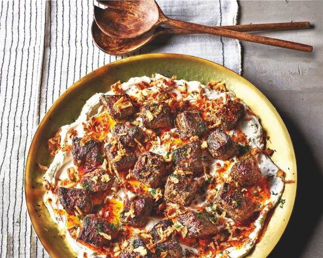 MARINATED STEAK WITH LABNEH, PUL BIBER BUTTER & CRISPY ONIONS