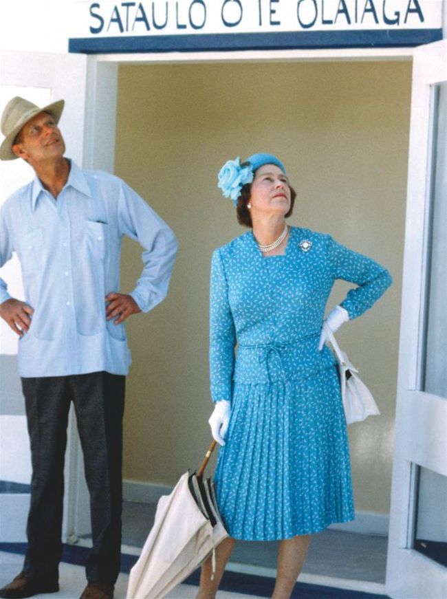 Casually leaning on a white parasol, the Queen gazes skywards as something catches her attention during her tour of the South Pacific in 1982.