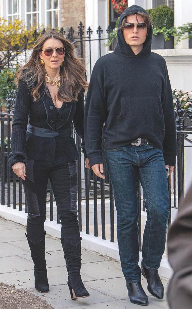 Elizabeth Hurley and son Damian wear black in London on the day before the funeral. The actress has posted a tribute to her former fiancé on Instagram
