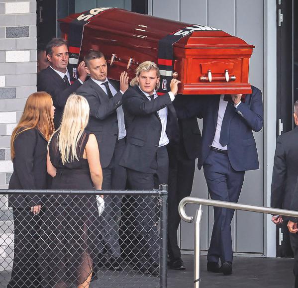 Shane’s coffin is carried by his son Jackson and others after the private service for the sportsman