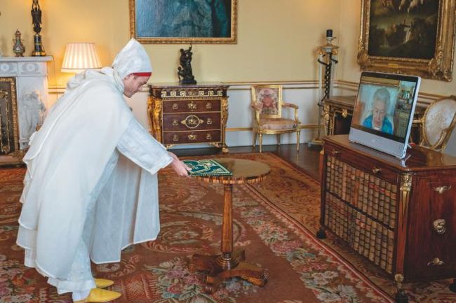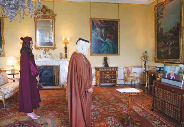 The Queen in virtual audience with Morocco’s ambassador to the UK Hakim Hajoui; and (left) Qatar’s ambassador Fahad bin Mohammed Al-Attiyah with Sheikha Raya Khalifa Abdulla Khalifa Al Khalifa