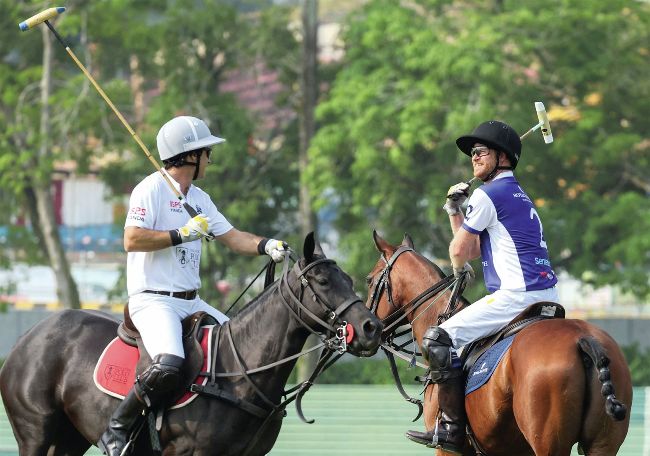 mood arriving at the Sentebale ISPS Handa Polo Cup in Singapore, wearing a blue shirt and white chinos for a sporty Saturday with good friend Nacho Figueras.