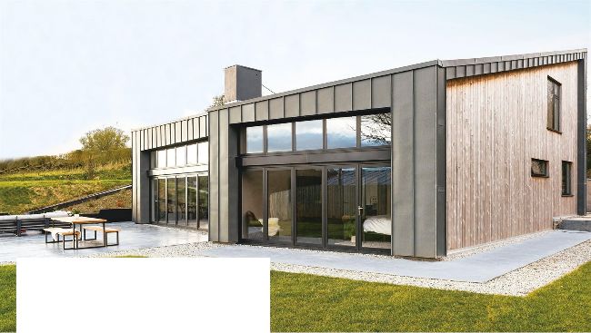 Proving that one-and-a-half-storey homes do not have to be traditional in their design, this striking contemporary house has been clad in sealed-seam zinc and cedar and features an unusual sloping roof.