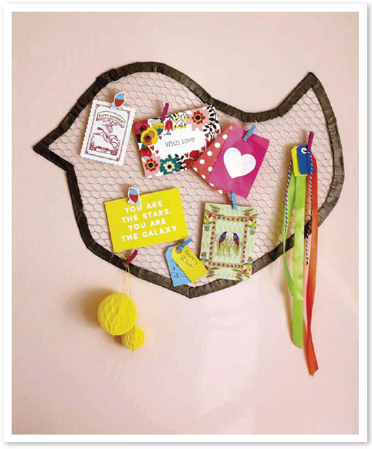 Inspired by Clare’s bird-shaped wire shelving, make a cute notice board from chicken wire to display your favourite messages, cards and tickets