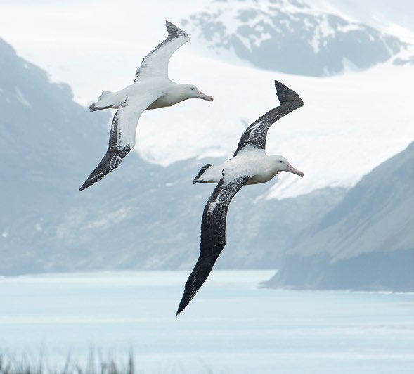 Albatrosses flying over snowy mountains in Antarctica