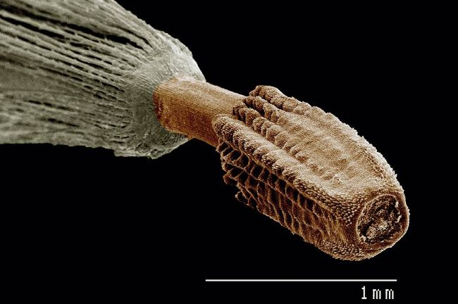 This is a scanning electron microscope image of a dandelion seed. The head of a dandelion can hold as many as 400 of these, but they tend to average at around 180. The brown, bulbous portion is known as the achene. The achene dislodges from the head of its parent plant and is carried by an umbrella of white feathery structures called a pappus, acting as a parachute to ride wind currents.