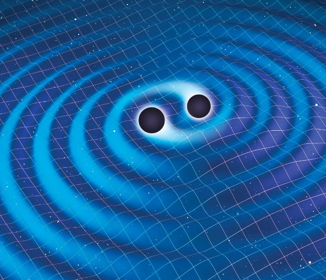 The merger of two black holes creates gravitational waves that propagate outwards through space-time