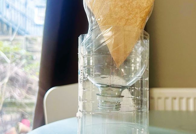 Place the top of the bottle upside down into the other half. Then place your coffee filter over the funnel-shaped opening.