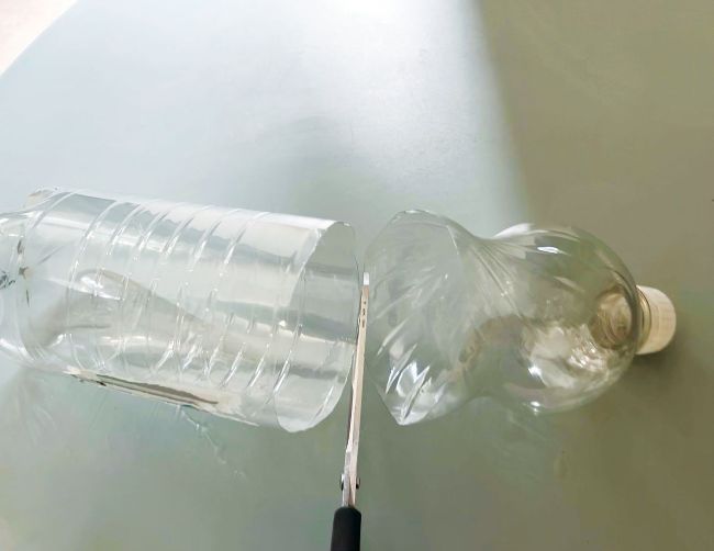 Poke a knife into the bottle halfway up its length. Then cut around the bottle to separate it into two halves.