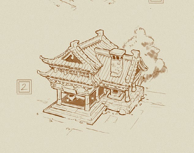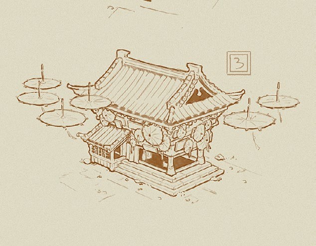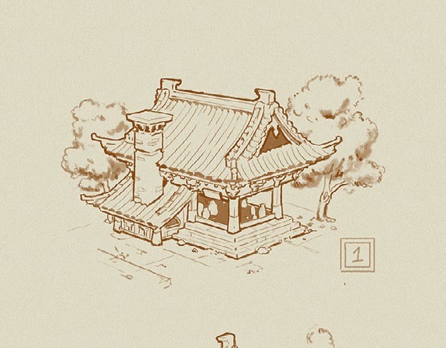 I focused on the building’s proportions and silhouette, with just enough detail to suggest the roof’s curvature, beams and structural elements. I explored the gimmick of hanging umbrellas, which I ultimately decided to go with.