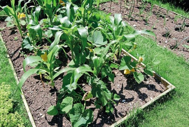 A young bed planted using the ‘three sisters’ – corn, squash and beans