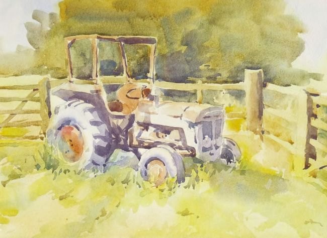 , watercolour, 10x14in. (25.5x35.5cm). The warmth of the greens and yellows in this painting is counterbalanced by the coolness of Dexta, the blue tractor.