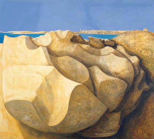 Rocks, St. Mary’s, Scilly Isles, oil on board, 401⁄2x45in. (103x114.5cm), from Virginia Woolf at Pallant House Gallery, Chichester