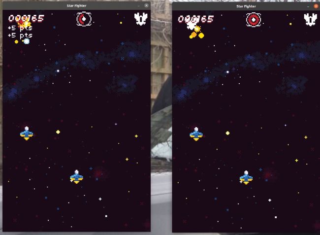 An example of multiplayer gameplay. Shown are both the server and client instance of the program running on the same device.