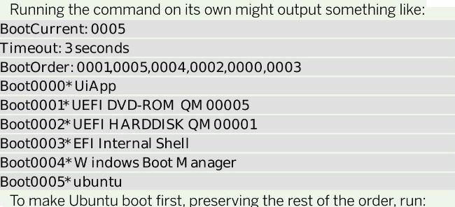 To make Ubuntu boot first, preserving the rest of the order, $ sudo efibootmgr -o 0005,0001,0004,0002,0000,0003 There isn’t really a Windows equivalent of efibootmgrto, but there is BCDEdit for editing Windows Boot Configuration Database. This deals only with Windows Boot Manager...