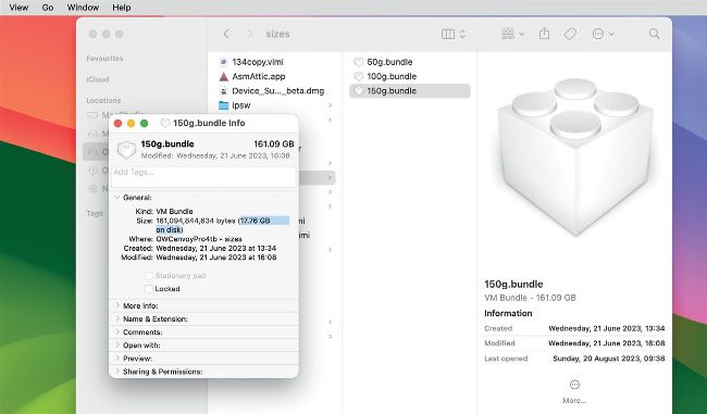 This virtual machine has a virtual disk size of 150GB, but as the Finder’s Get Info shows, it takes up less that 18GB.