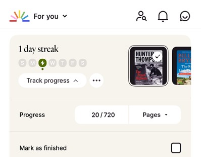 Need motivation? Create a streak on the Home tab by tapping I Read Today. Tap Track Progress, pick a book, enter your pages read, then tap Update.