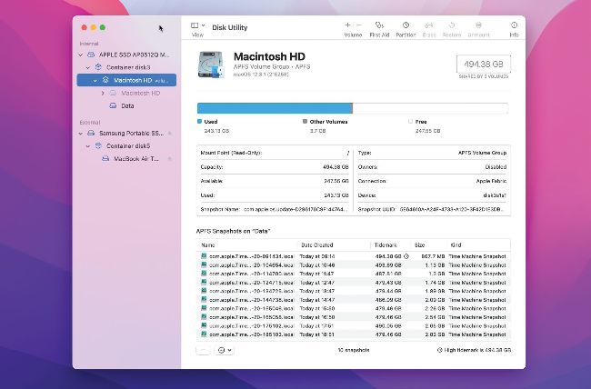 In Monterey, Disk Utility allows you to view and work with Time Machine snapshots.