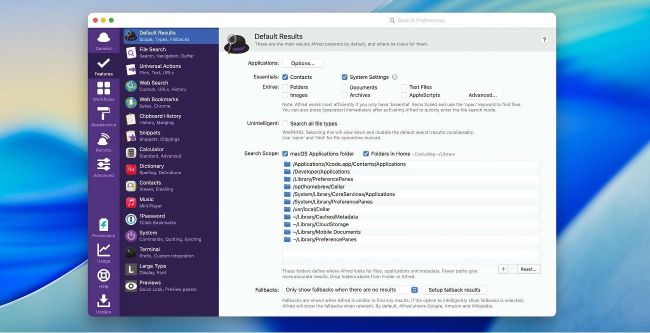 LIKE THE PERFECT butler, Alfred is far more than Spotlight search done right. Add its Powerpack, and you can use its temporary file buffer to gather multiple files and perform actions on them, browse PDFs using a ready–made workflow, and build yourself a collection of snippets to paste.