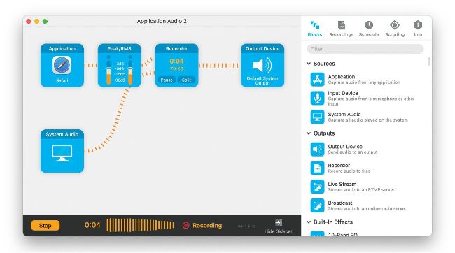 AUDIO HIJACK IS an app that is able to intercept any audio stream on your Mac from a hardware source such as your microphone or a record player and also from any application or from macOS itself. Using a clever system of configurable drag–and–drop blocks, it lets you route one or more sources through a virtual recorder, capturing the sound to a digital audio file. You can even add effects like noise reduction, add multiple recorders for compressed and uncompressed recording, and schedule recordings to begin at specific times.