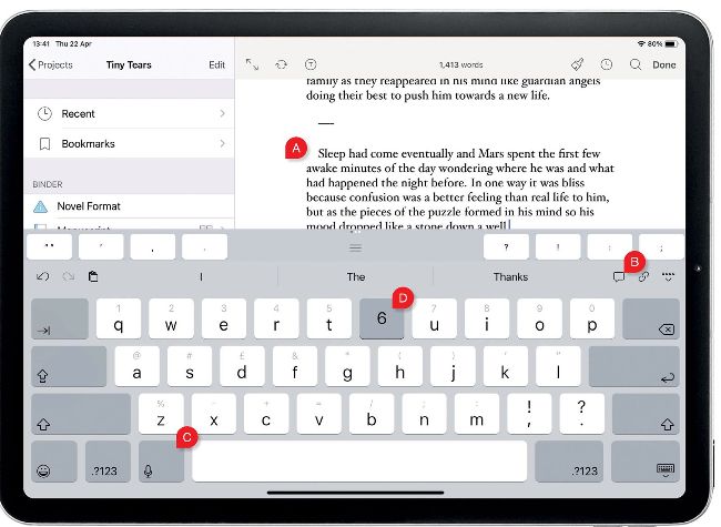 The main disadvantage of using the iPad software keyboard is that it takes up half the screen, which lessens how much text you can view. However, you will be working on a much smaller and more portable device while typing.