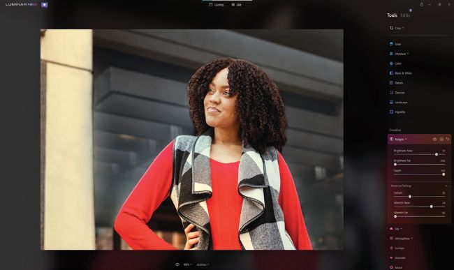 Once you’ve got an image open, it’s time to see what the app can do. One of our favorite features is Relight, an AI tool that splits your image into near and far layers and allows you to alter the brightness of each individually. It helps if you give it a photo that plays to its strengths—perhaps one in which your subject is standing between clear foreground and background objects— and use the Depth slider to set the point at which they’re fully diverged [Image A]. Then you can play with the Brightness Near and Brightness Far sliders, to see what effects they will add.