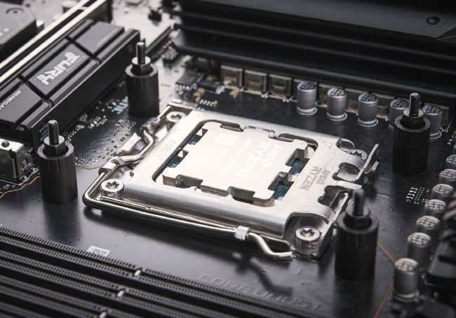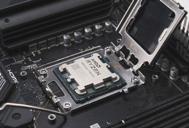 This journalist should have paid more attention. If you cast your eyes to [Image 02], you’ll notice a very nice, clean, closeup shot of the installation process behind the Ryzen 7 7800X3D. Now, we specifically asked for the motherboard box the mobo was sat on to be included in this shot. Clearly it hasn’t been. All fool on us for not double-checking, but for your reference, it’s always worth preparing your motherboard on top of the product box itself, as it acts as a fantastic anti-static temporary workbench. Just remember not to put it on the outside of the antistatic bag on top of the box, because that, er, conducts static.