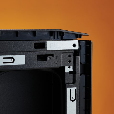 Removing the back of the case reveals the bare I/O ports. With this back panel off, we can slide the side panels toward the back of the case to pop them off. The last part to open is the top compartment. This is a hinged door that houses the system’s cooling fans and doesn’t need to be fully removed. To open this up, locate the two ‘PULL’ indicators on the hinge (see inset), as these point towards where you can lift the hinge up. Apply slight pressure and pop this up to reveal the opened NUC 12 case.