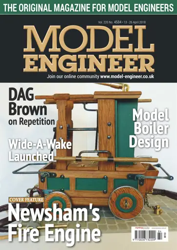 4584 John Clarke constructs a miniature replica of Richard Newsham’s innovative fire engine, which was granted a patent by George I in 1721. Martin Johnson explains what really goes inside model boilers and how he constructed an accurate computer model for predicting their behaviour. Roger Backhouse spends an engineer’s day out at the Denny experimental model ship tank at Dumbarton. Wide-A-Wake finally arrives at the day for its launch. Ramon Wilson describes the completion of its engine rebuild and its introduction to the water. DAG Brown ruminates on repetitive machining and reveals how he goes about the mass production of cones for injectors. Wolfgang Tepper continues his description of the construction of an unusual opposed piston two stroke engine, which possesses one cylinder, two pistons and three connecting rods. Anthony Mount makes a water pump for his Ferrabee stationary engine. Martin Gearing fabricates the body of the boiler’s hand feed pump and provides a few pointers on the art of silver soldering. Graham Sadler demonstrates how to make a tailstock die holder. Terence Holland begins the construction of a new boiler for his Barclay well tank and describes a useful tool for forming shoulders on the ends of the tubes.
