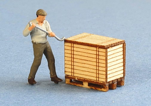 This pack by Busch provides an instant cameo scene of a man prying open a wooden crate. The (real) wooden crate stands on a timber pallet and the figure comes fully painted. A useful 148mm by 105mm sheet of card paving is also provided.