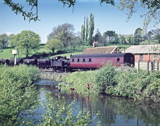 While children frolic in the River Culm, ‘14XX’ No. 1466 simmers away in Hemyock’s platform in May 1963, with a single ex-LNER four-compartment brake coach in tow. Note the grubby six-wheel milk tanks in the background.