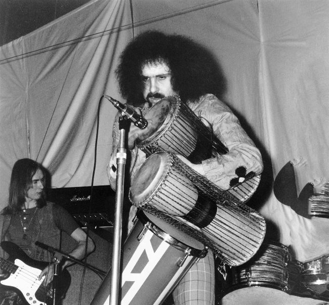 He bangs the drums: Pete Brown & Piblokto! start the art school dance, Copenhagen, 1970.