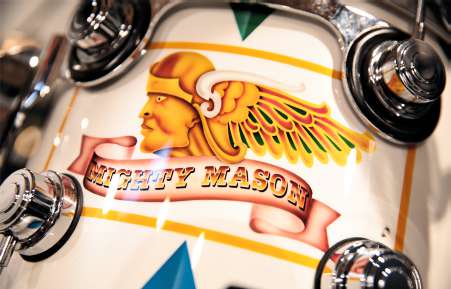 “Yes, I am tempted, and we have looked at that, and we might do that,” he gently laughs, sitting behind dr ums whose shells are illustrated with a cartoonish Native American war riorcum-biker figure and emblazoned with the playful legend “Mighty Mason”.