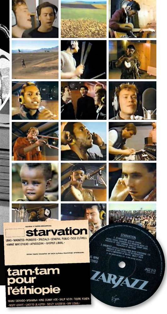 It’s a givin’ thing (clockwise from main): motivator Jerry Dammers gets on the blower in the Melody Maker offices; his Paris opposite number Manu Dibango; scenes from the Starvation video, with UB40 and sundry 2-Tone faces; the single.