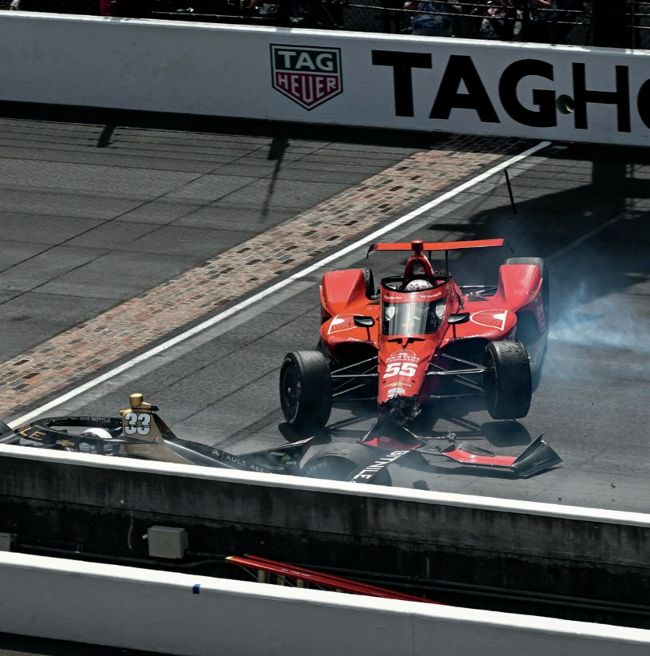 Carpenter (33) collision, inset. Newgarden (2) beat Ericsson in a single-lap shootout, then headed into the crowd for a joyous celebration, below
