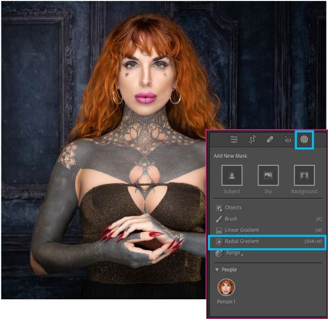 Open the Start.jpg start image then go to the Masking icon in the toolstrip under the Histogram, and select the Radial Gradient option from the list. Alternatively, you can use the shortcut Shift+M to activate the tool without going through the two clicks needed to get to it.