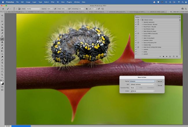 Go to the Actions panel and click the plus icon at the bottom to make a new Action. Give it a name and hit Record. From this point until you press the stop button in the Actions panel, every edit, command, brush stroke and setting you change will be recorded in the Action. You’ll see steps appear in the panel for each change you make. Some of these can be expanded to give you more info on what is included in the step. After pressing the Stop button, you can repeat the sequence on other pictures by highlighting the Action name and pressing play.
